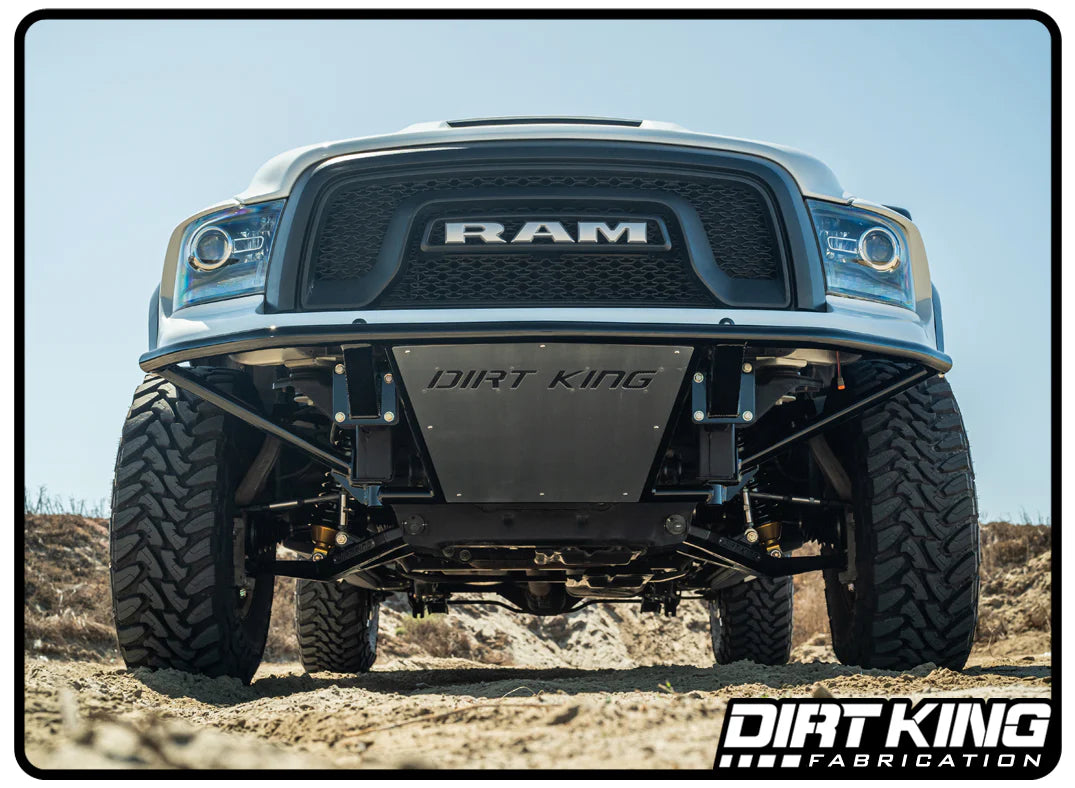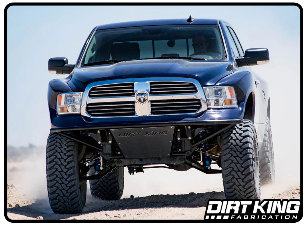 The Dirt King long travel kit was developed to drastically improve the vehicles off-road handling without compromising its day to day driving characteristics. This suspension system allows for 13.5” of travel and accepts up to a 37” tire. The kit is compatible with 2WD models and 4WD models along with the purchase of extended axle shafts. Our upper and lower arms are designed with 1” stainless steel uniballs for the outer pivots instead of ball joints for strength and increased articulation. This kit is the first of its kind, it’s a complete bolt on application with no cutting or welding to the frame on 4WD models. The suspension system was originally developed for Ram Trucks new concept vehicle, the Ram Rebel TRX which was released in mid-2016. After its amazing performance we decided to put the kit in production and make it available to the public!