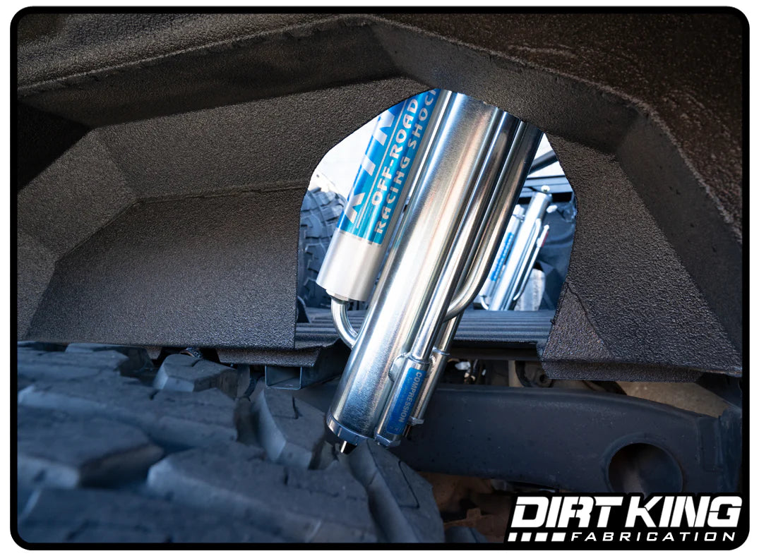 The Dirt King bed cage spec king bypasses are custom built for optimum performance. After building countless trucks with standard off the shelf bypasses we found that there was a lot of room for improvement by modifying the bypass tube locations and valving. This resulted in a smooth ride on road and through small terrain while it gets progressively stiffer when going through rough terrain or jumps. The shocks and ready right out of the box for leaf over or leaf under sprung trucks. To fine tune the ride quality a shock tech can quickly make adjustments without removing the shocks from the vehicle. Please note that bypass shocks are noisy due to the steel needle that engages and disengages when fluid bypasses the piston.