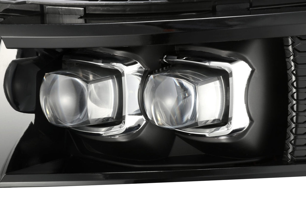 Unveil superior lighting with these 07-13 Chevrolet Silverado NOVA-Series LED Projector Headlights Black, featuring innovative Ice Cube 3D projectors and intense Osram Oslon Black Chip LEDs. AlphaRex combines patented technology with LUXX LEDs for unmatched dual beam performance. Adhere to American LHD standards with a precise cut-off line. Upgrade for activation lights, sequential turn signals, and DRL.